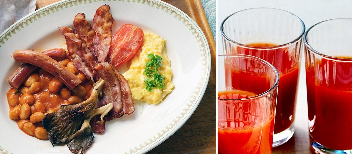 Det finns förstås också många personliga skillnader. Somliga föredrar streaky bacon (den variant vi i Sverige är vana vid), andra kotlettbacon, som är magrare och lite mer som rökt skinka. Black pudding ratas av en del, älskas av andra. Tomatjuice tillhör egentligen amerikansk brunch mer, men är så oemotståndligt gott.