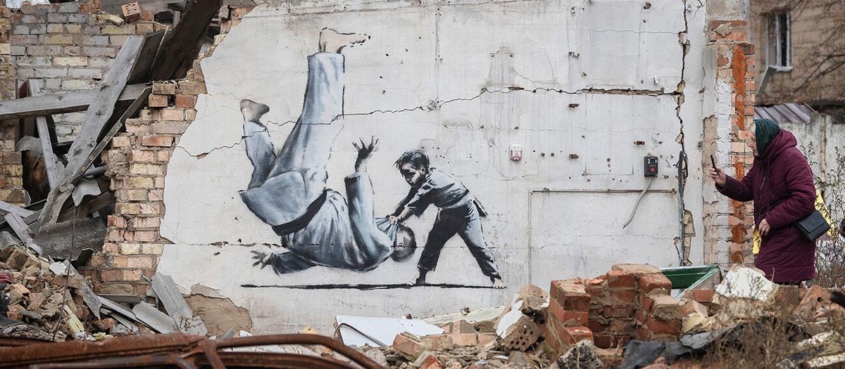 På sin egen Instagram delade Banksy en bild på en gymnast som balanserat på rasmassorna av ett hus med texten ”Borodjanka, Ukraina”.