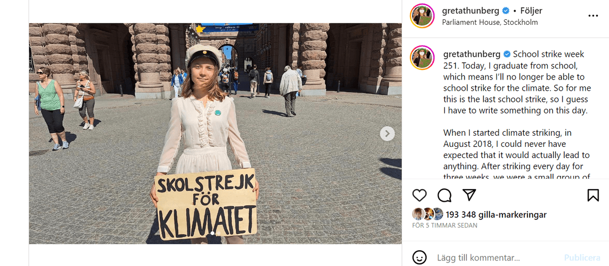 ”Skolstrejk vecka 251. Idag tar jag examen från skolan, vilket innebär att jag inte längre kan skolstrejka för klimatet. Så för mig är detta sista skolstrejken, så jag antar att jag måste skriva något denna dag.